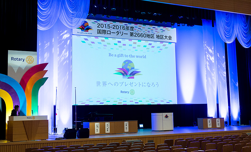 ロータリーの最新情報や地区内の活動状況について学び、他のクラブと交流を目的とするイベント。82のロータリークラブが集まり、ミニコンサートやシンポジウムなど様々なコンテンツを展開。>ステージ進行、装飾、映像などトータルプロデュース。